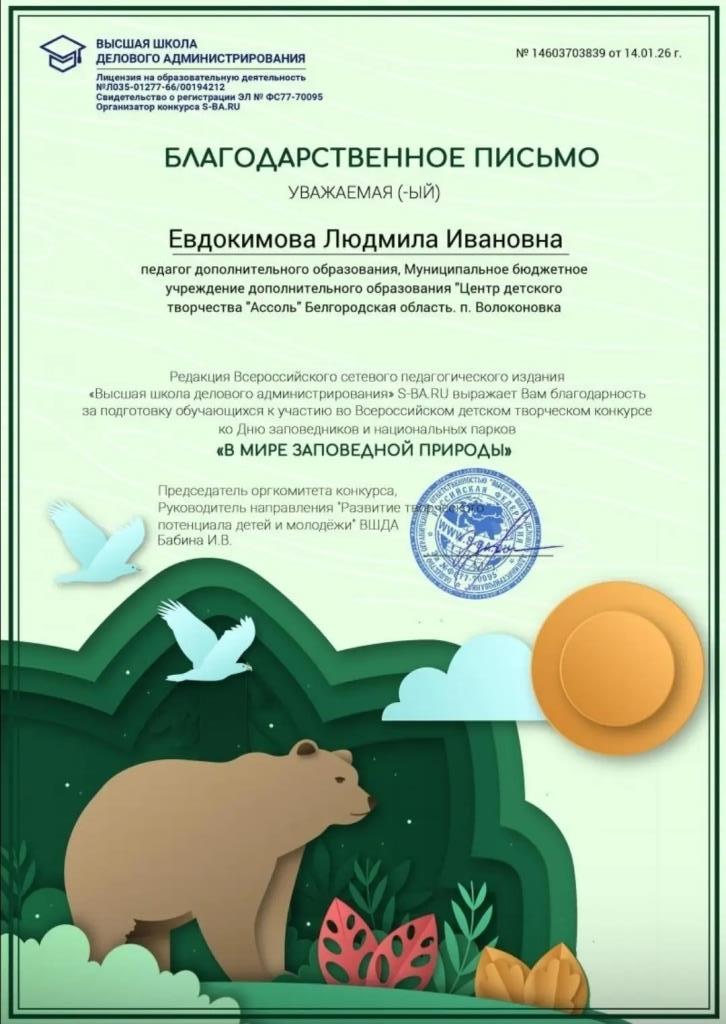 Поздравляем Образцову Наталию с победой во Всероссийском детском творческом конкурсе ко Дню заповедников и национальных парков "В мире заповедной природы". Желаем дальнейших успехов!!!