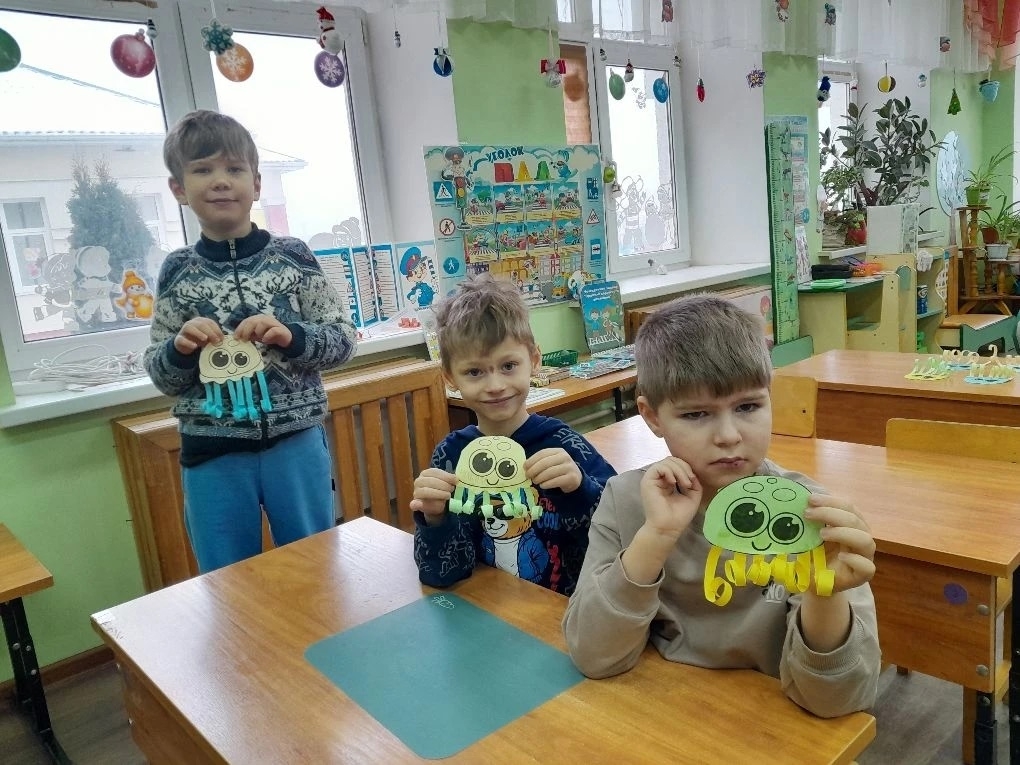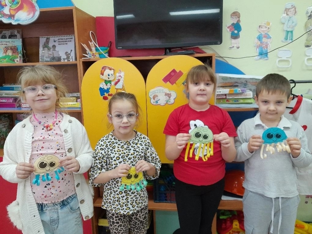 В образцовом детском коллективе "Мастерская чудес" для дошкольников ребята изготовили аппликацию из бумаги "Медуза"