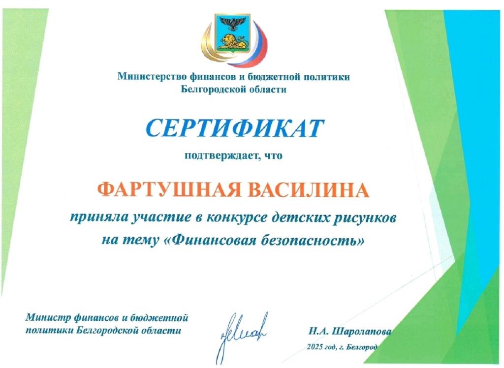 Поздравляем обучающуюся образцового детского коллектива «Юный художник» Фартушную Василину, принявшую активное участие в конкурсе детского рисунка на тему «Финансовая безопасность»