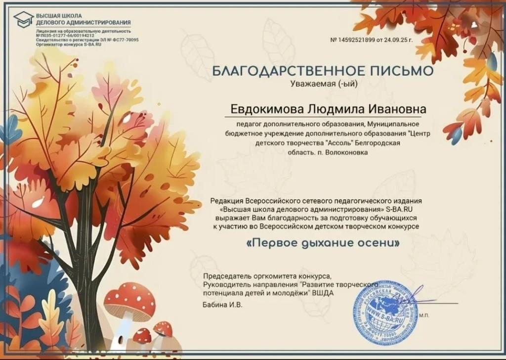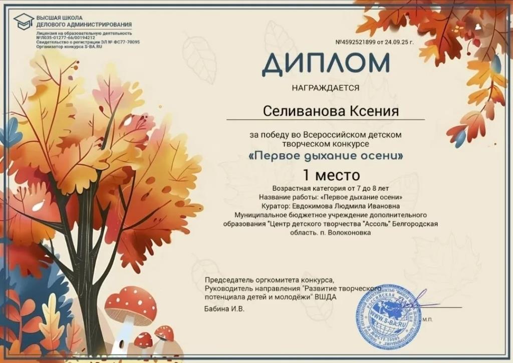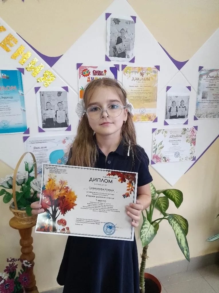 Поздравляем Селиванову Ксению с победой во Всероссийском детском творческом конкурсе "Первое дыхание осени". Желаем дальнейших успехов!!!
