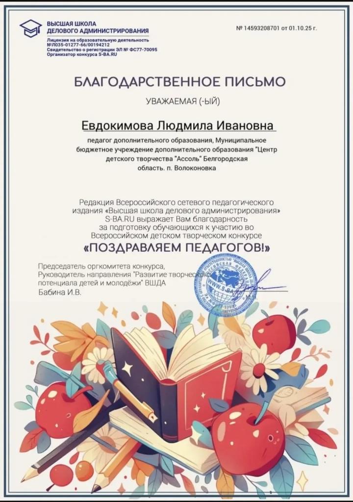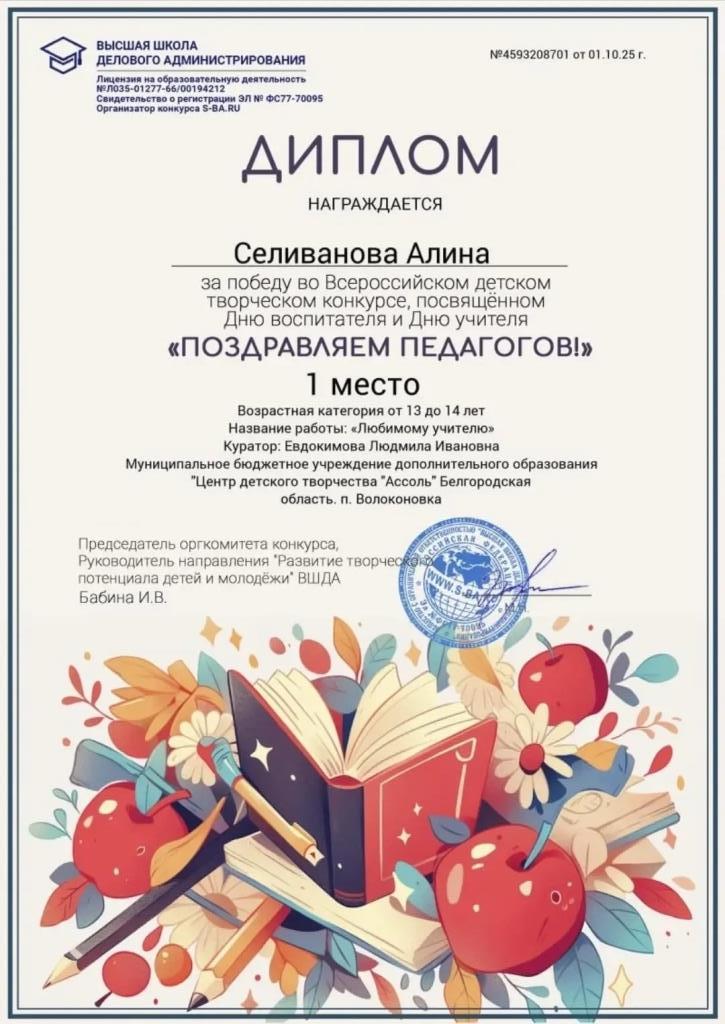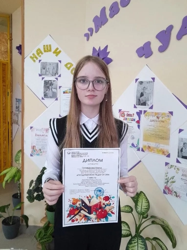 Поздравляем Селиванову Алину с победой во Всероссийском детском творческом конкурсе, посвящённом Дню воспитателя и Дню учителя "Поздравляем педагогов!". Желаем дальнейших успехов!!!