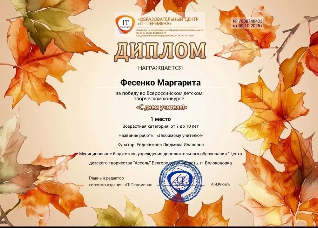 Поздравляем Фесенко Маргариту с победой во Всероссийском детском творческом конкурсе "С днём учителя!". Желаем дальнейших успехов!!!