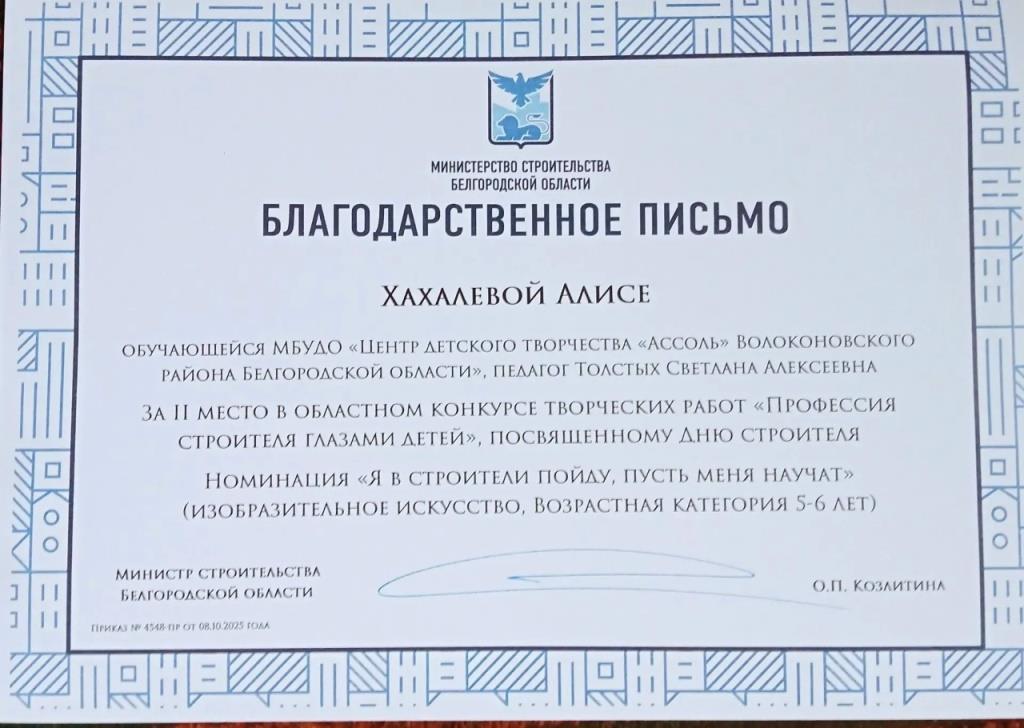 Поздравляем Хахалеву Алису! Обучающаяся творческого объединения «Юный художник» Центра детского творчества «Ассоль» стала победителем областного конкурса творческих работ «Профессия строителя глазами детей».