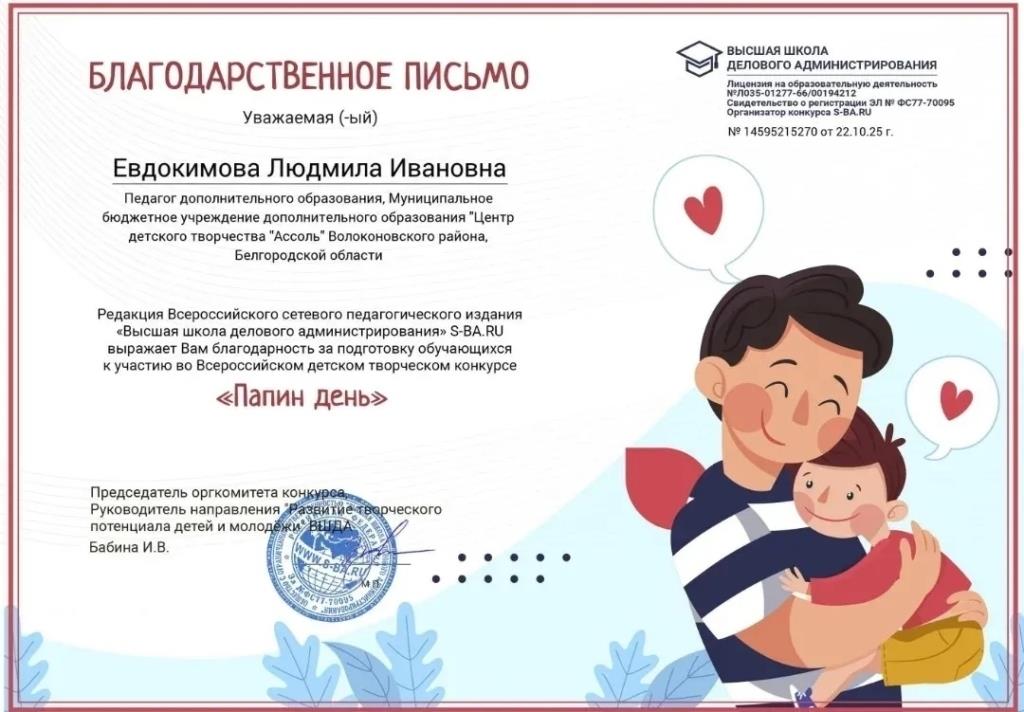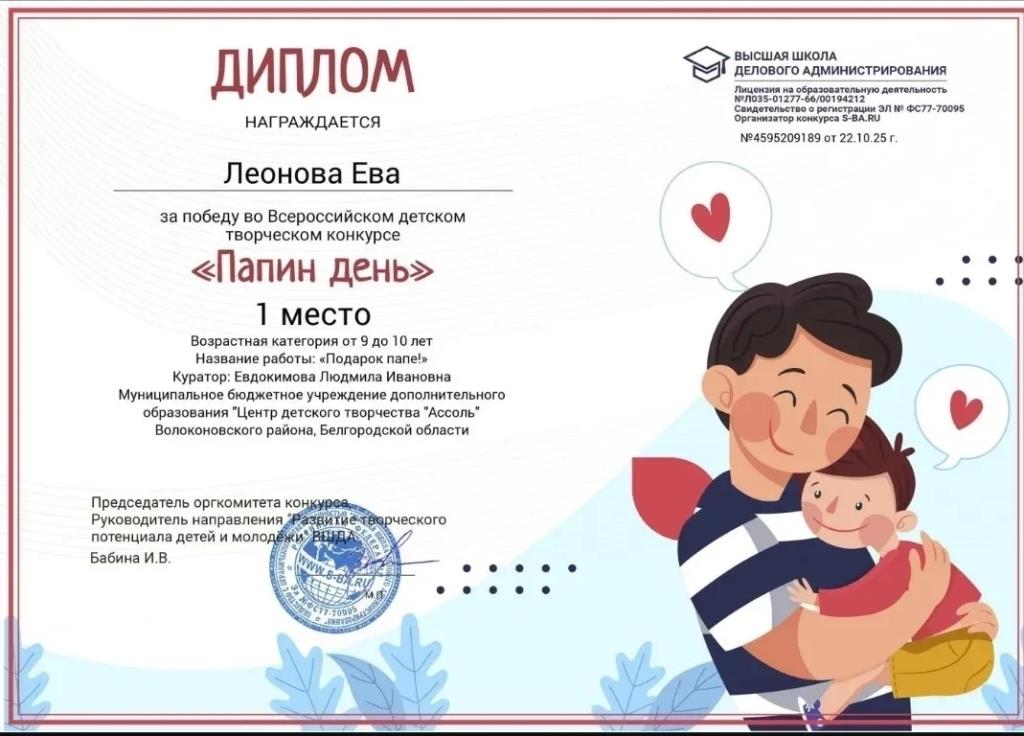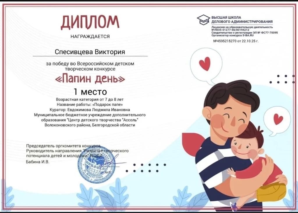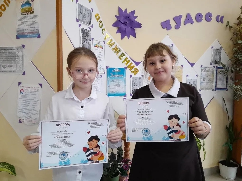 Поздравляем Спесивцеву Викторию, Леонову Еву с победой во Всероссийском детском творческом конкурсе "Папин день". Желаем дальнейших успехов!!!