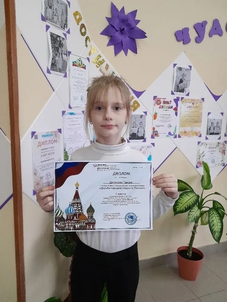 Поздравляем Шитикову Таисию с победой во Всероссийском детском творческом конкурсе "Дружба народов - гордость России!". Желаем дальнейших успехов!!!