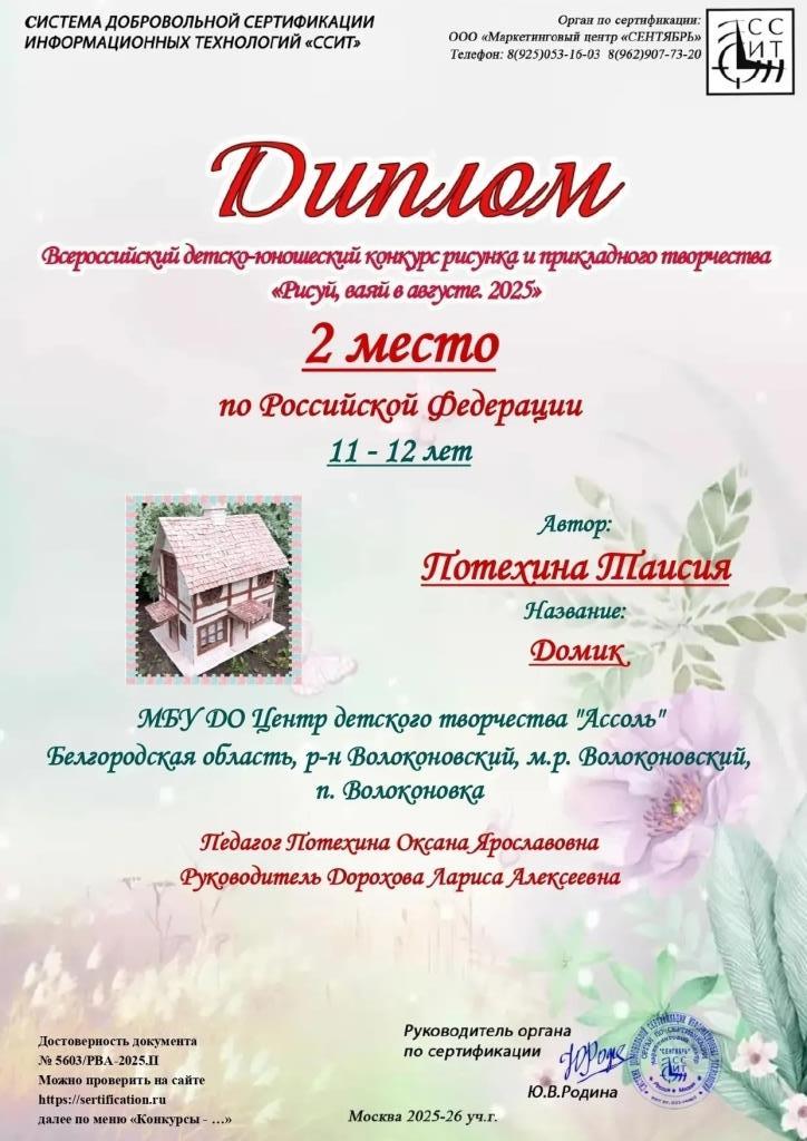 Поздравляем Потехину Таисию с победой во Всероссийском детско-юношеском конкурсе прикладного творчества "Рисуй, ваяй в августе. 2025". Желаем дальнейших успехов!