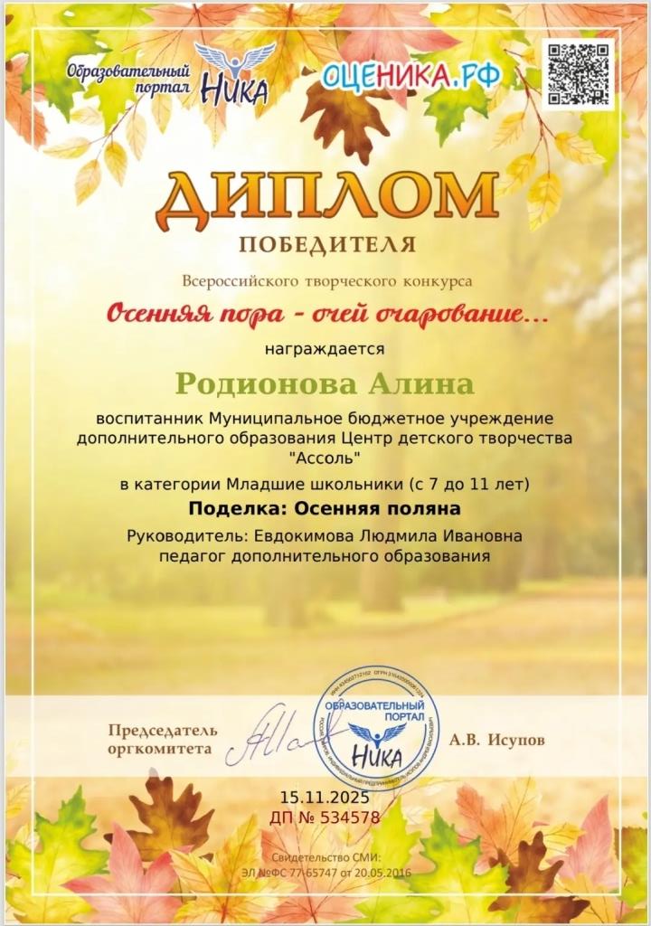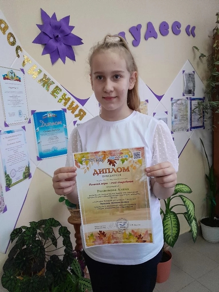 Поздравляем Родионову Алину с победой во Всероссийском творческом конкурсе "Осенняя пора - очей очарование...". Желаем дальнейших успехов!!!