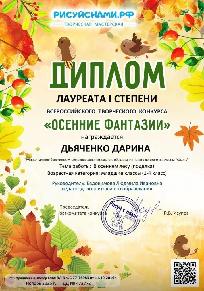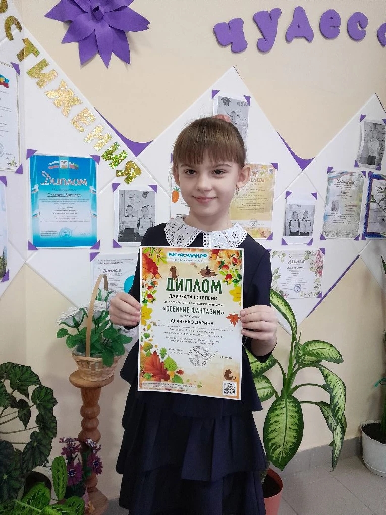 Поздравляем Дьяченко Дарину с победой во Всероссийском творческом конкурсе "Осенние фантазии". Желаем дальнейших успехов!!!