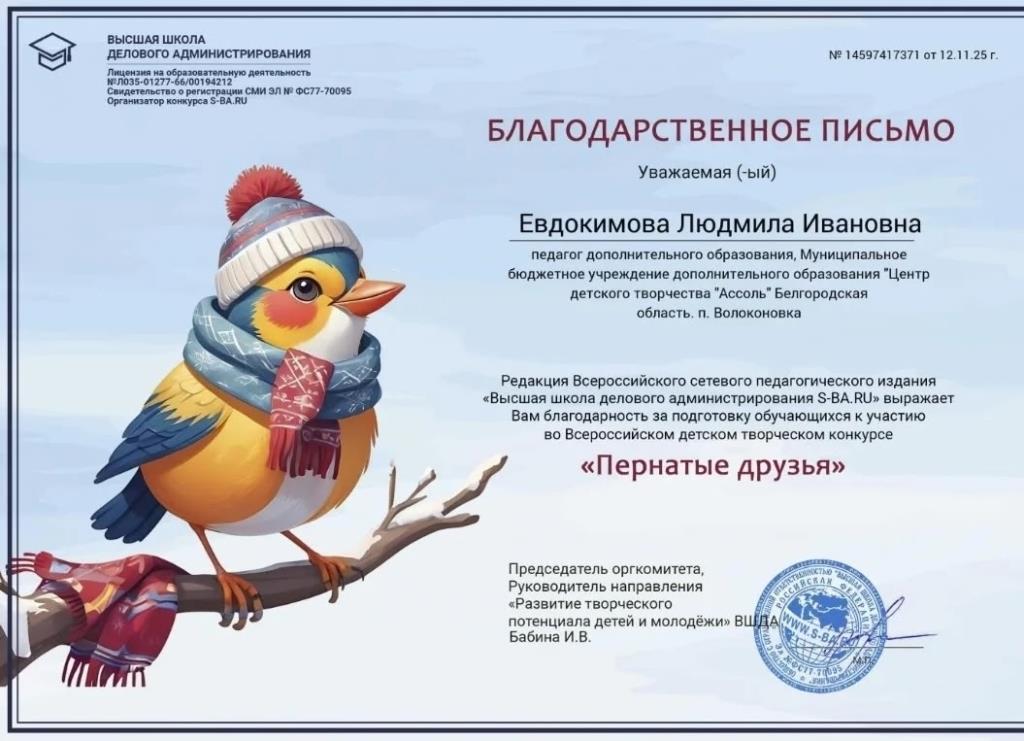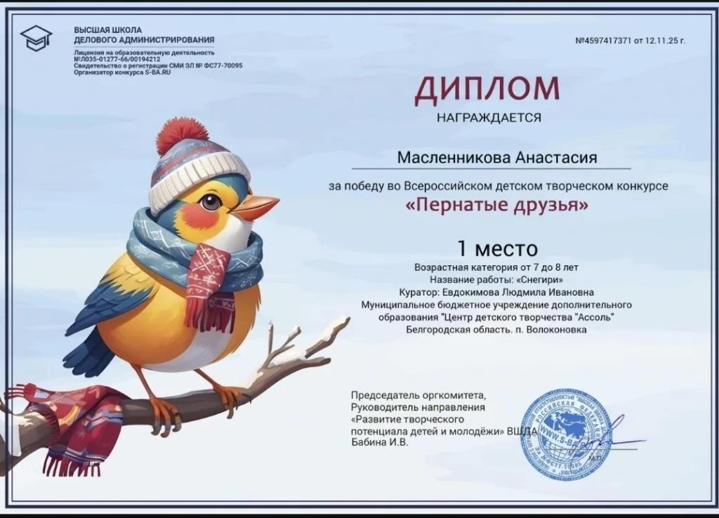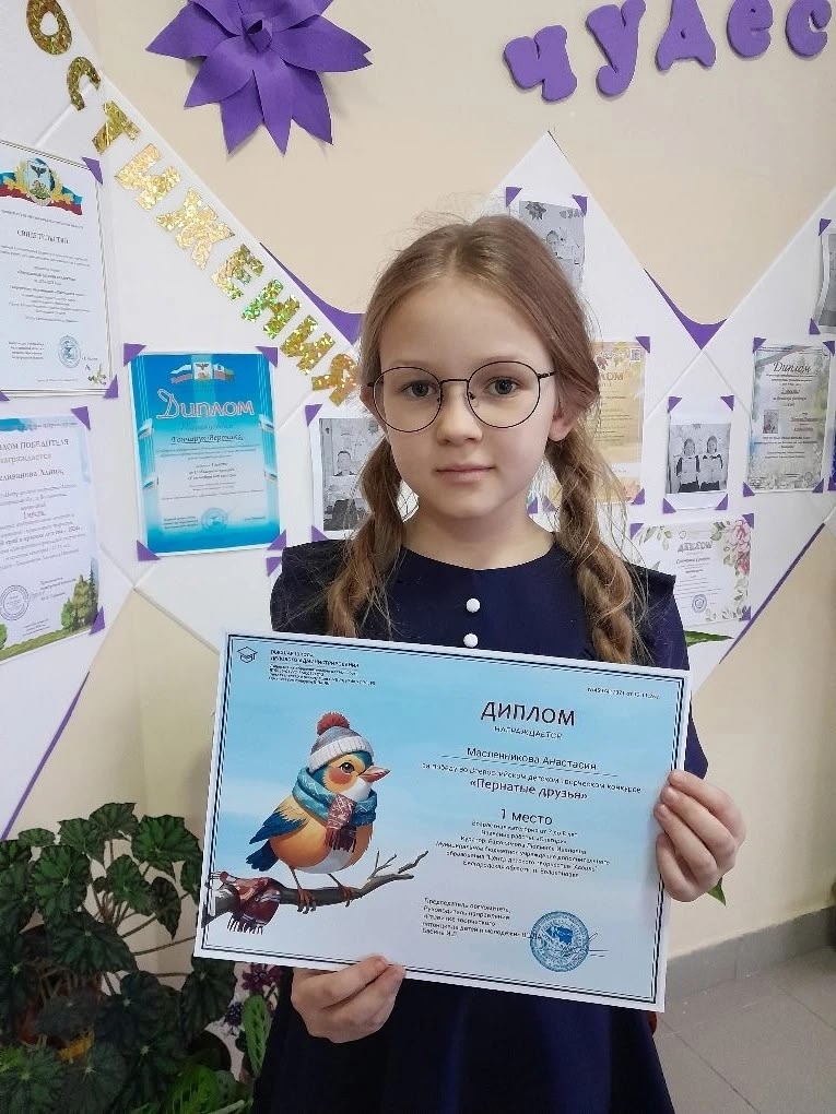 Поздравляем Масленникову Анастасию с победой во Всероссийском детском творческом конкурсе "Пернатые друзья". Желаем дальнейших успехов!!!