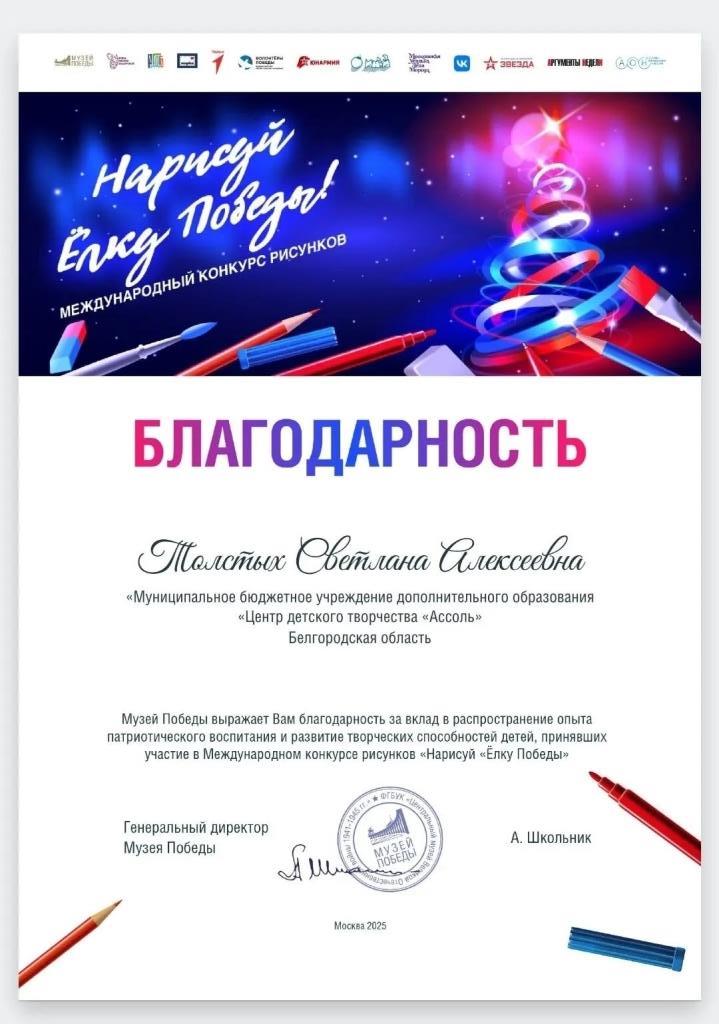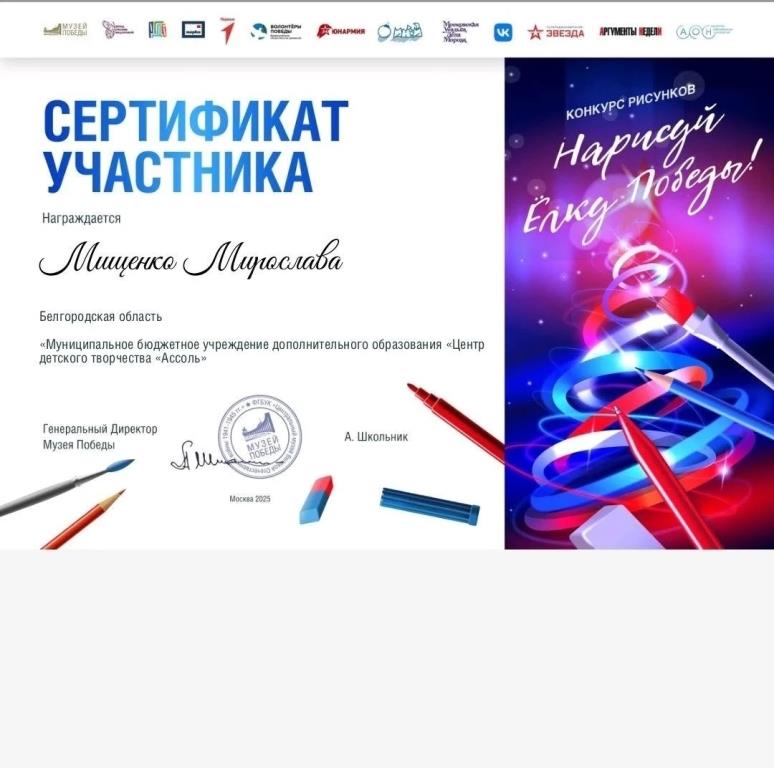Поздравляем Мищенко Мирославу, принявшую участие в Международном конкурсе детского рисунка «Нарисуй Ёлку Победы» Желаем дальнейших успехов и побед!