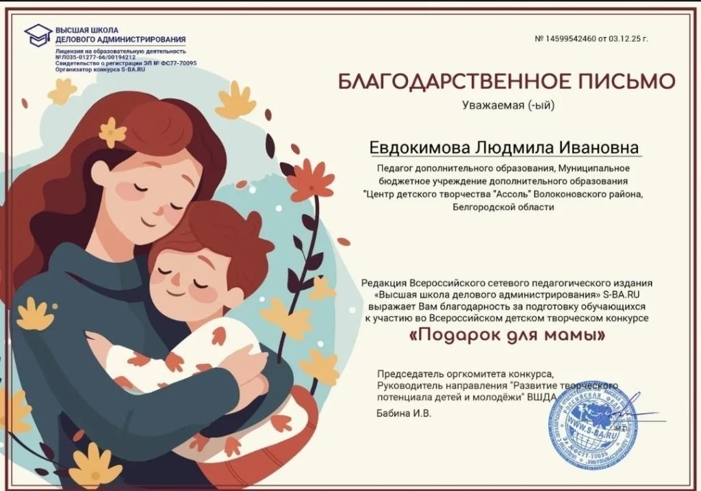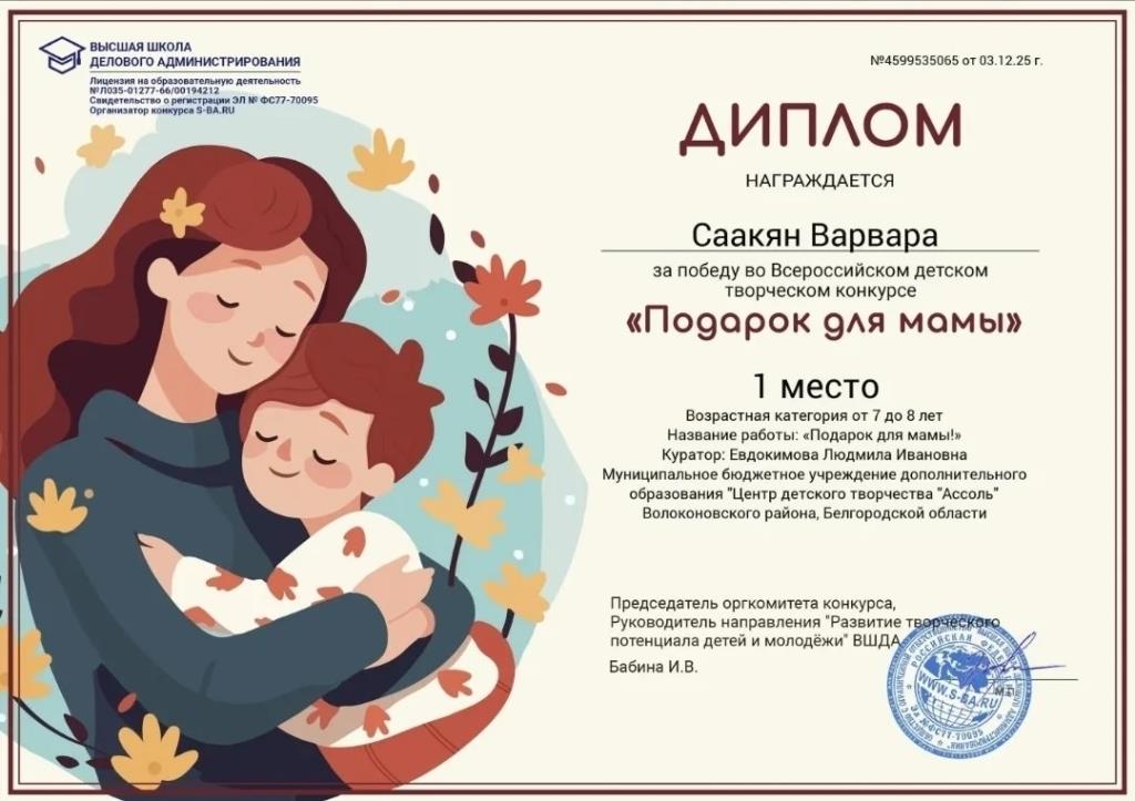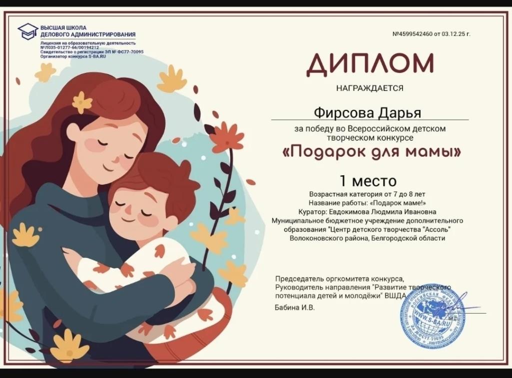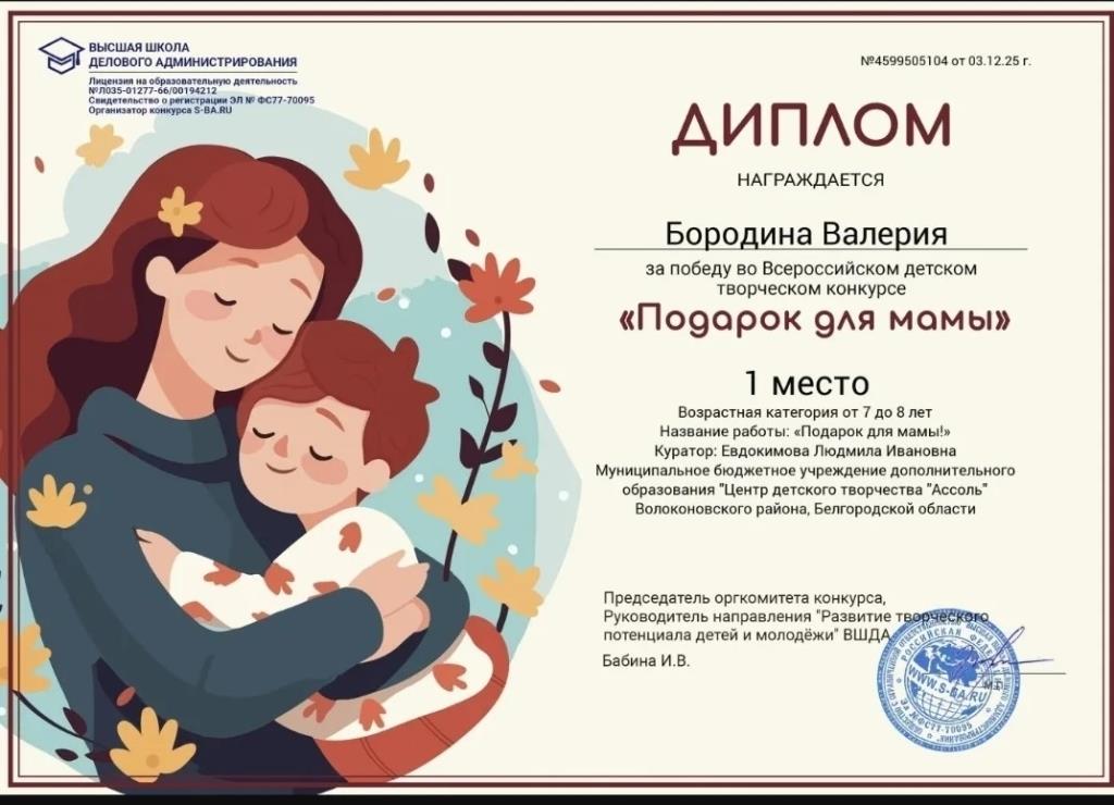 Поздравляем Бородину Валерию, Саакян Варвару, Фирсову Дарью с победой во Всероссийском детском творческом конкурсе "Подарок для мамы". Желаем дальнейших успехов!!!