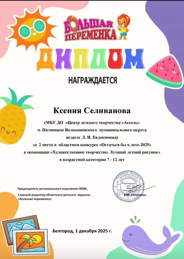Поздравляем Селиванову Ксению с победой в областном конкурсе "Остаться бы в лете - 2025" в номинации "Художественное творчество. Лучший летний рисунок". Желаем дальнейших успехов!!!