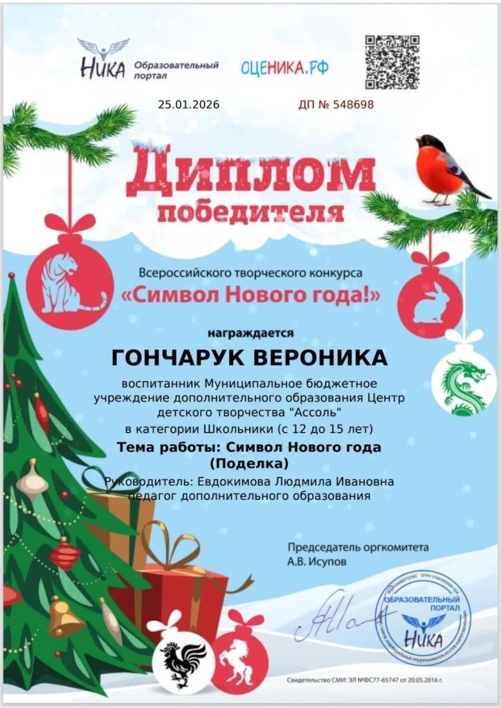 Поздравляем Гончарук Веронику с победой во Всероссийском творческом конкурсе "Символ Нового года!". Желаем дальнейших успехов!!!