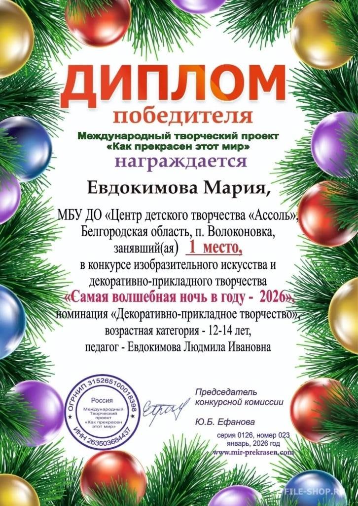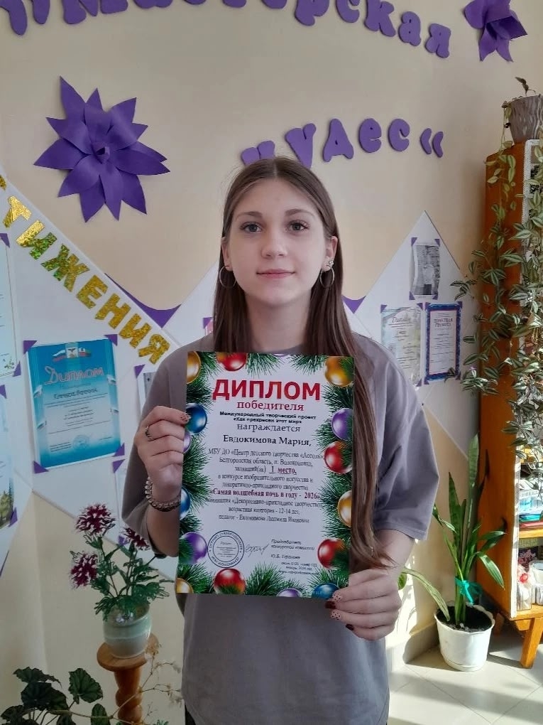 Поздравляем Евдокимову Марию с победой в Международном творческом проекте "Как прекрасен этот мир" в конкурсе декоративно- прикладного творчества "Самая волшебная ночь в году - 2026". Желаем дальнейших успехов!!!